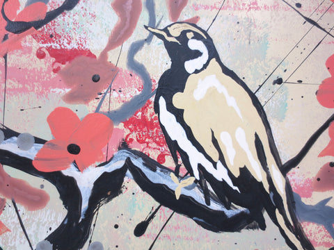 Original acrylic on flakeboard painting by Quebec artist signed Jérôme Rochette, 23 3/4 X 28 inches. Portrays a bird on a bonsaï tree branch surrounded by pink flowers, captured under a glass display dome. From a 2014 series of scenes and events also portrayed under a glass dome.