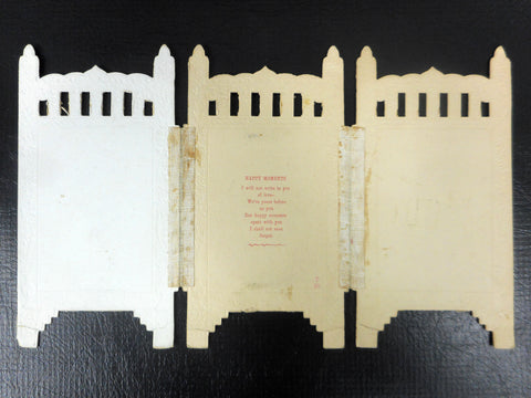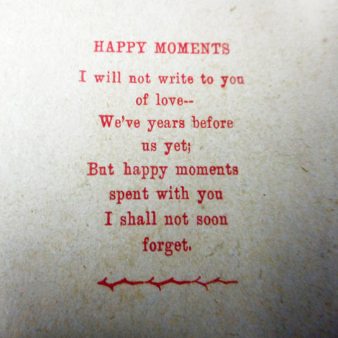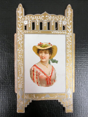 Authentic Victorian wish card and picture frame from the early 1900's, mint condition, vivid colors. Rare, unused, center space to add a photo. Divided and folded in 3 panels, stands well on its own. Beautiful montage of a lady, rose flower, angel and lace. Dimensions: 6 1/4 X 10 1/4 inches (opened), or 3 1/4 inches (unopened). Center print says "Happy Moments. I will not write to you of love, We've years before us yet, But happy moments spent with you I shall not soon forget".