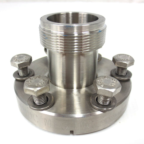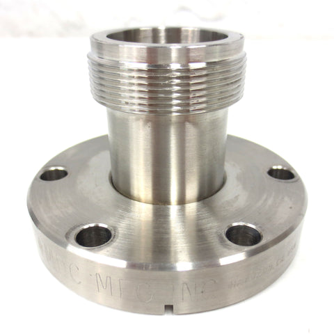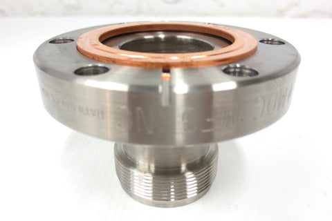Excellent condition, very clean, ready to install. Complete with a copper gasket and 6 mounting bolts. 2.75 inches diameter high vacuum chamber conflat flange adapter with a 1 in diameter tube coupler (1 3/8" including threads), rotatable, made by MDC Hayward. 2 in tall, thick 1/2 in high quality stainless steel base. Surplus from a cryogenic laboratory. Total weight 407 grams.