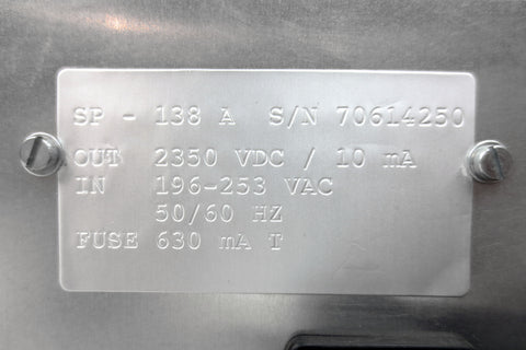 New, inspected and functional, no box. High quality power supply transformer by Amilcon Switzerland, model SP-138 A. Connector and power cord included. Specifications: Output 2350 VDC/M 10mA, Input 196-253 VAC 50/60 Hz, fuse 630 mA T. Serial 70614250. Measures 4 X 4 X 7 inches and weighs 1.97 kg.