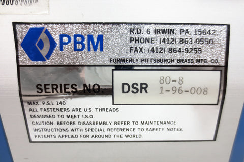 Excellent condition, inspected and functional, ready to install. Pneumatic actuator valve with indicator by PBM, series DSR 80-8, 1-96-008. Specifications: Maximum 140 P.S.I, 2 Amp-120 VAC, 2 Amp-24 VDC. Measures 6 X 14 1/2 X 6 1/2 inches and weighs 4.74 Kg.