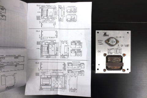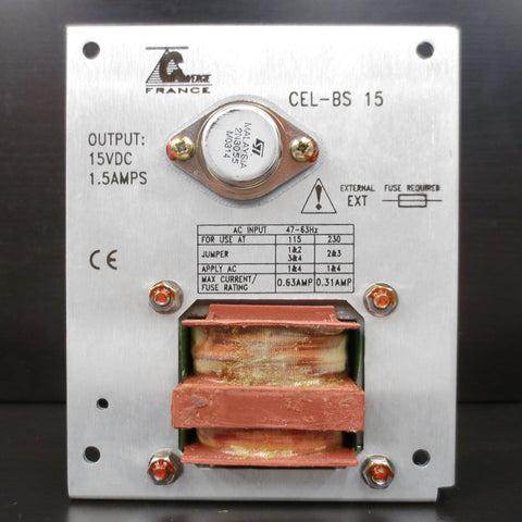 Inspected, functional, very lighly used. With instructions (French), no box. Power supply model CEL-BS 15 by Convergie France, Sodilec / Fontaine / Etri. Specifications: 15 Vdc and 1.5 Amps output, 115-230 V and 47-63 Hz AC input, 0.63-0.31 Amp max current. Measures 4 X 4 3/4 X 1 5/6 inches and weighs 950 grams.