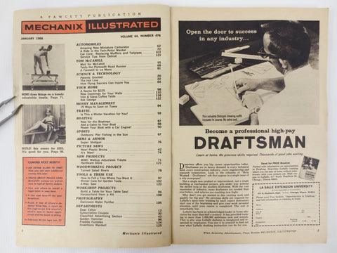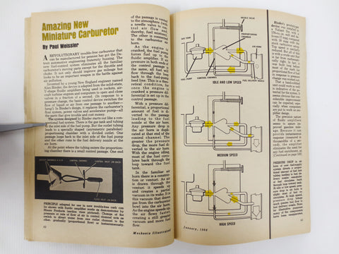 Mint condition, Mechanix Illustrated published by Fawcett, dated January 1968. Complete with its original ads and coupons. Contains car revues by Tom McCahill, Plymouth Road Runner test drive, featured advertising for Renault 10, article "How Flying Saucers can Injure You", tools and DIY projects and much more. Measures 6 1/2 x 9 1/4 inches, 138 pages. Hundreds of funny and very 1960's advertising.